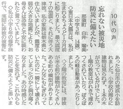 「東日本大震災は、私が生まれるちょうど1ヶ月前に起こりました。・・・私は小学6年の修学旅行で、実際に津波の被害にあった仙台市の荒浜小を訪れました。・・・あのとき感じたことを忘れず、これからも防災に備えようと思います。」